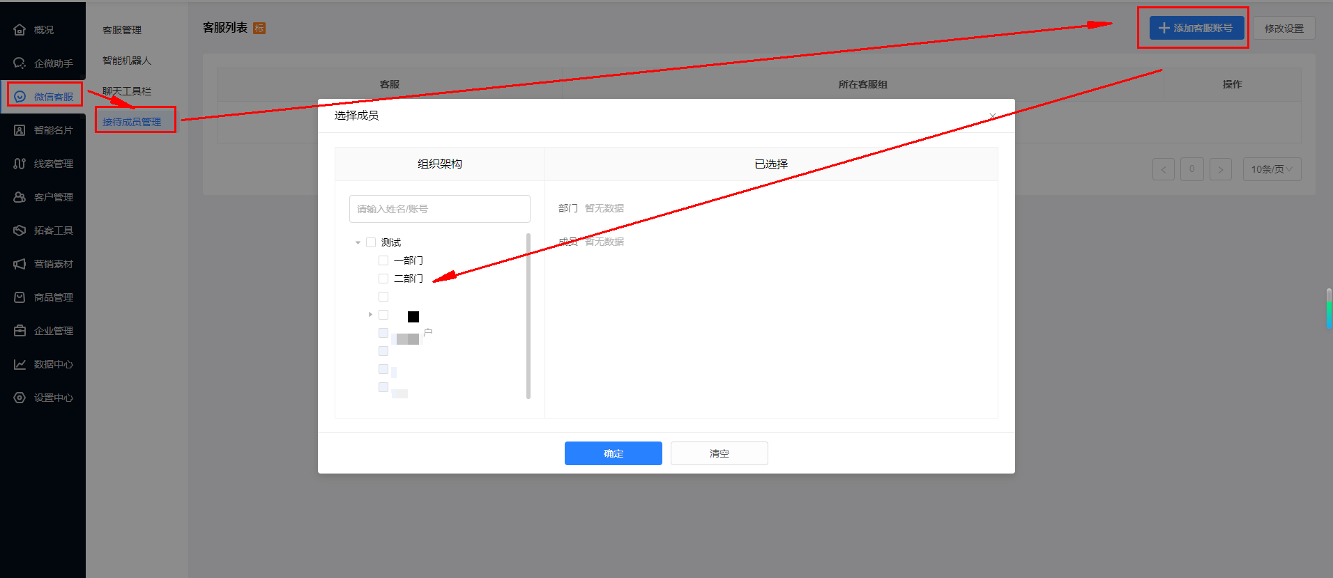 ② 跳转到销售系统后,在微信客服--接待成员管理--添加客服中,选择部分企微成员,加入到【客服列表】