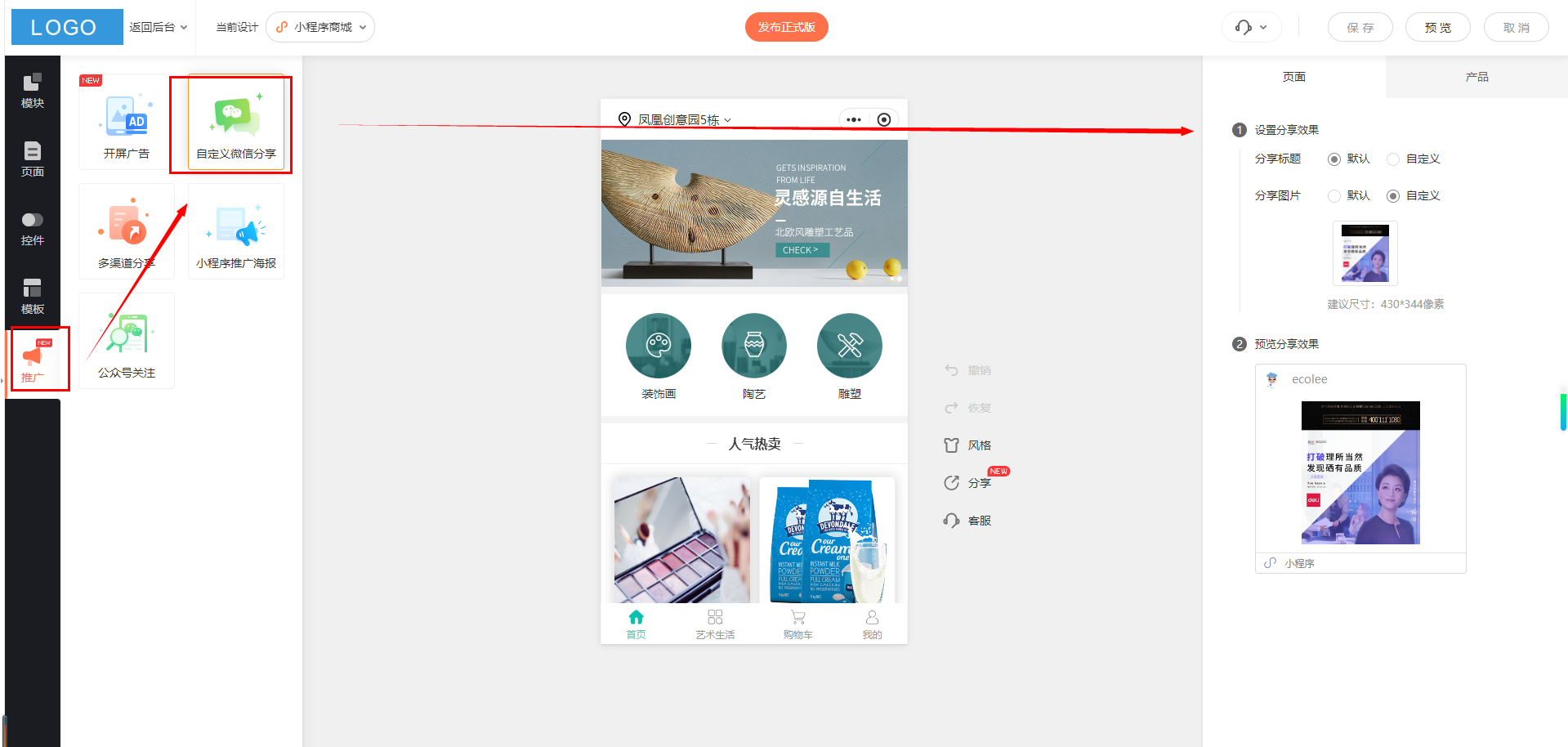 进入商城小程序设计界面,点击【推广】-【自定义微信分享】,可以设置分享标题、分享图片。