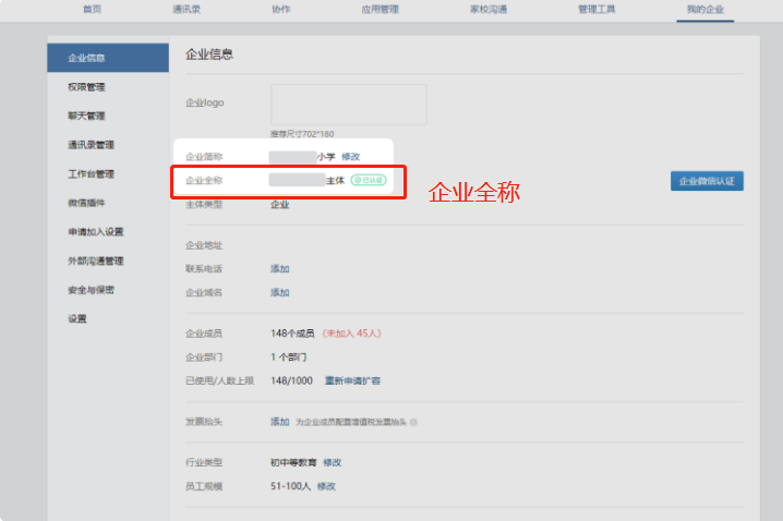 ① 微信小程序主体必须和企业微信的【企业全称】一致;仅支持非个人主体小程序