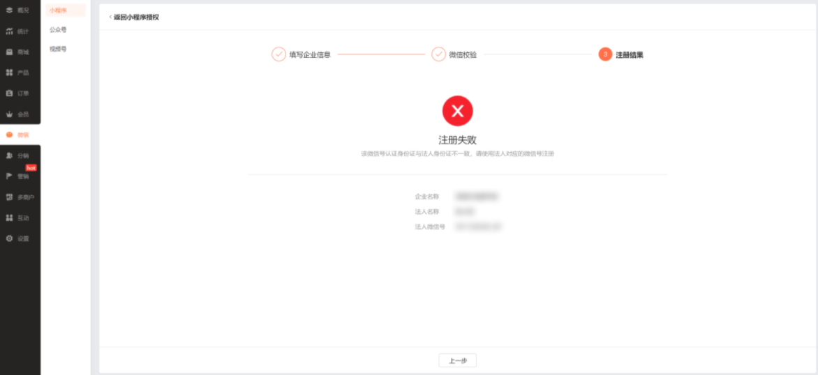 4. 在完成微信校验后,如各类信息无误,商家即可完成小程序转正。如注册失败,可根据给出的失败原因自查,重新注册。