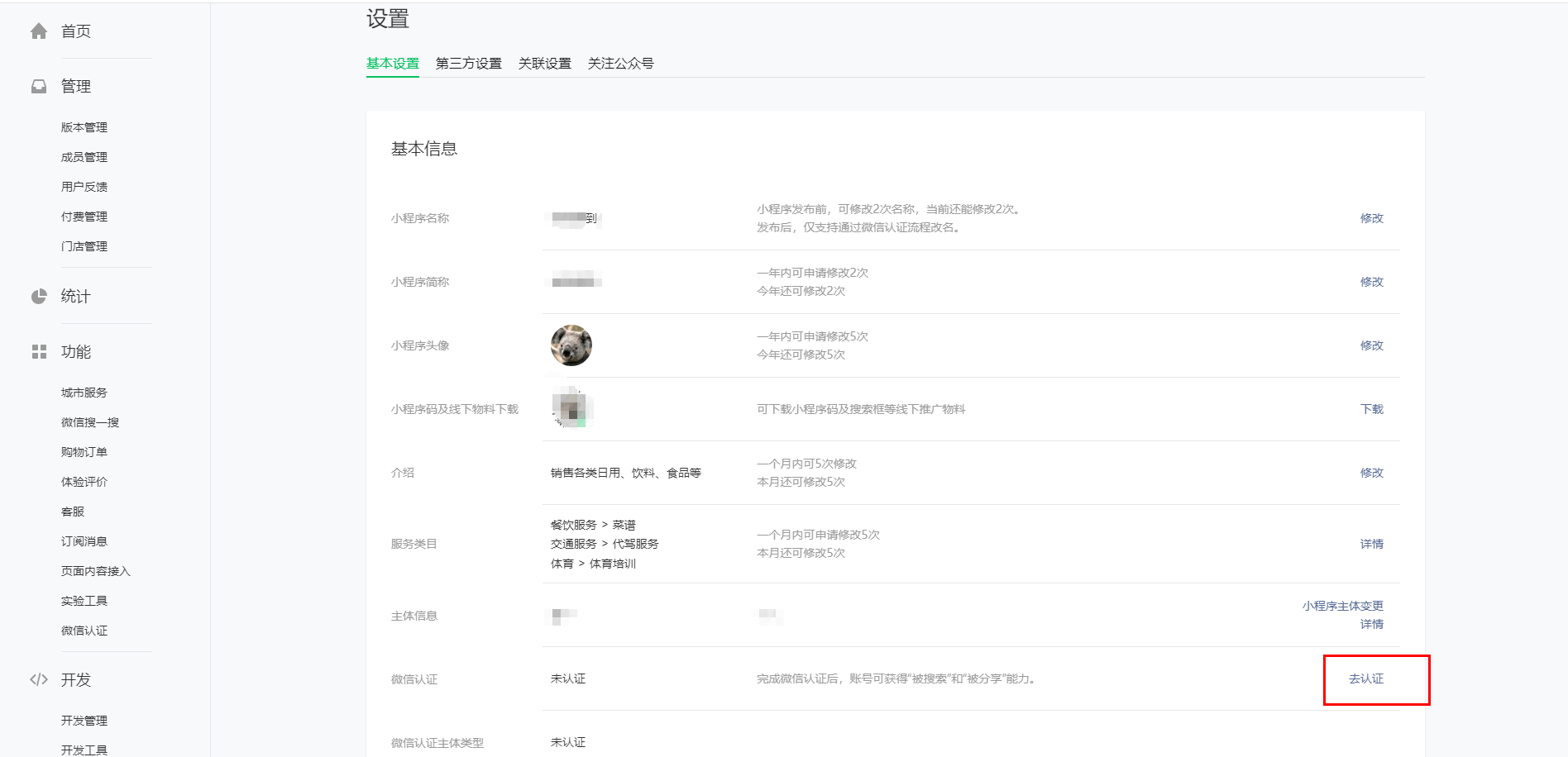 6. 如您需要修改小程序名称、头像,可前往小程序设置后台,设置服务类目,设置完成后即可修改小程序头像、名称。