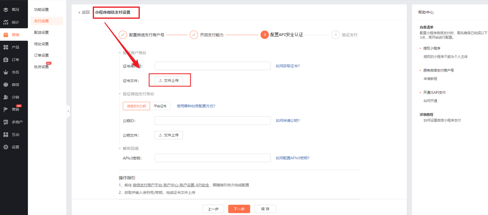 ① 当要设置小程序微信支付时,请根据路径【商城管理后台-商城-功能设置-支付设置-小程序微信支付】,将证书(也就是命名为“apiclient_cert.p12”的文件)上传到相应位置。