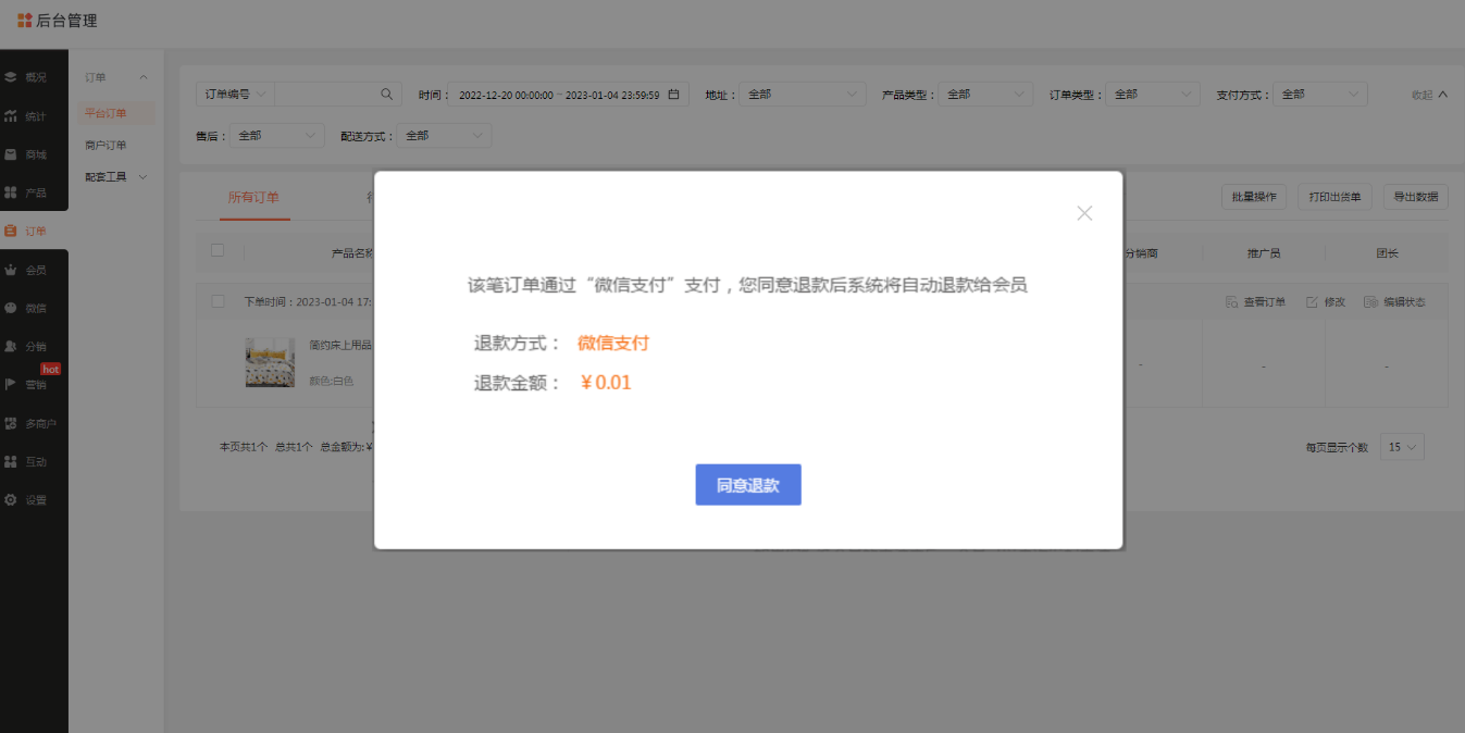 完成设置之后,当商家收到买家使用微信支付的退款订单时,点击“同意退款”这一按钮,可实现一键退款给买家。