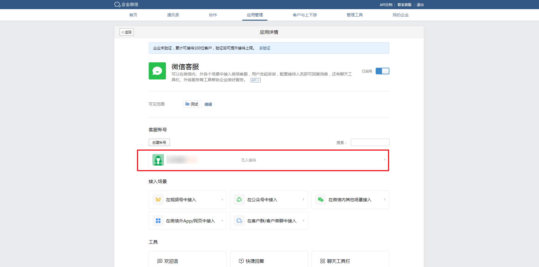 登录企业微信管理后台(https://work.weixin.qq.com),前往应用管理-微信客服,点击进入。