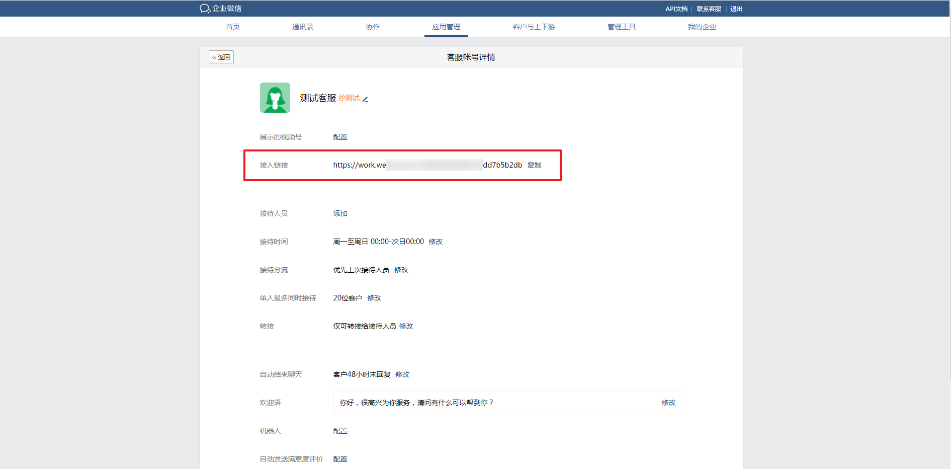 点击进入具体的客服账号信息,复制该客服账号的跳转链接,并填入商城小程序的客服信息中即可。