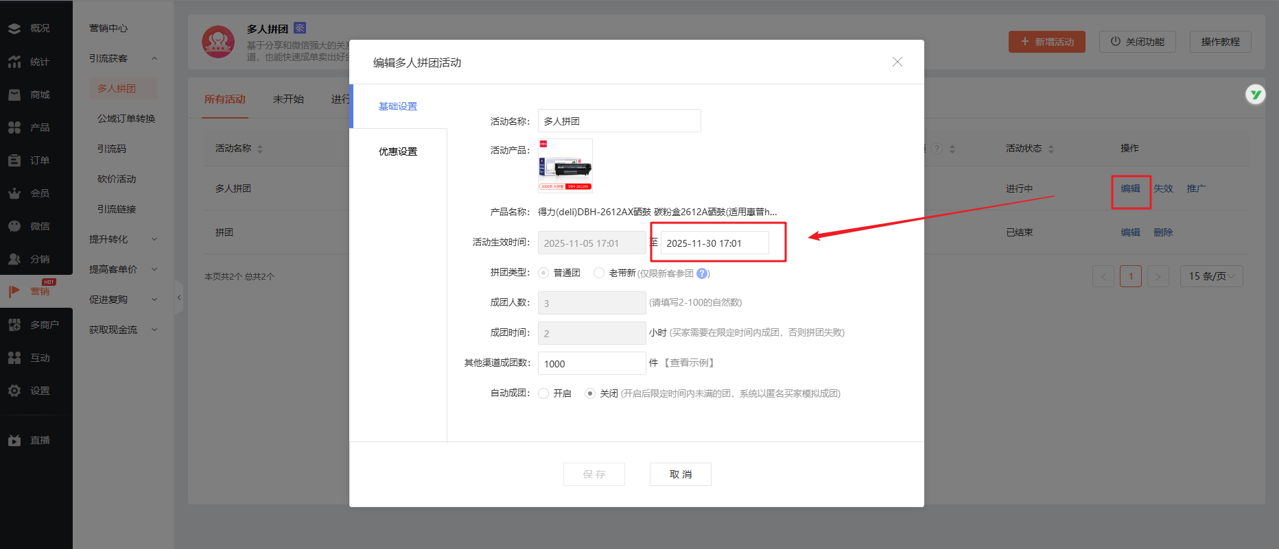 可以,进入【商城管理后台-营销-引流获客-多人拼团】中,点击拼团活动的“编辑”按钮,在如下图的位置可修改活动结束时间,修改后点击“确定”即可生效。