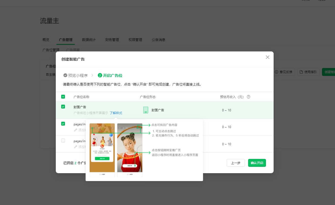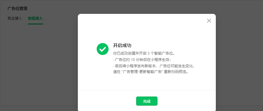 点击后小程序管理者进行扫码,可以获取对应广告位广告,点击确认开启即可