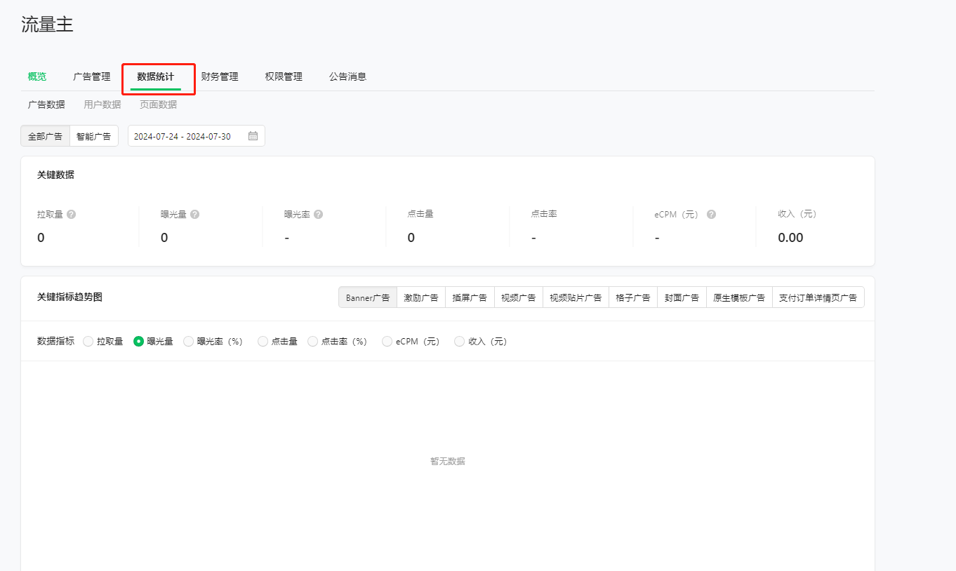 进入【微信小程序后台-推广-流量主-数据统计】中,可以分广告位查看每日的曝光量、点击量以及收入数据。
