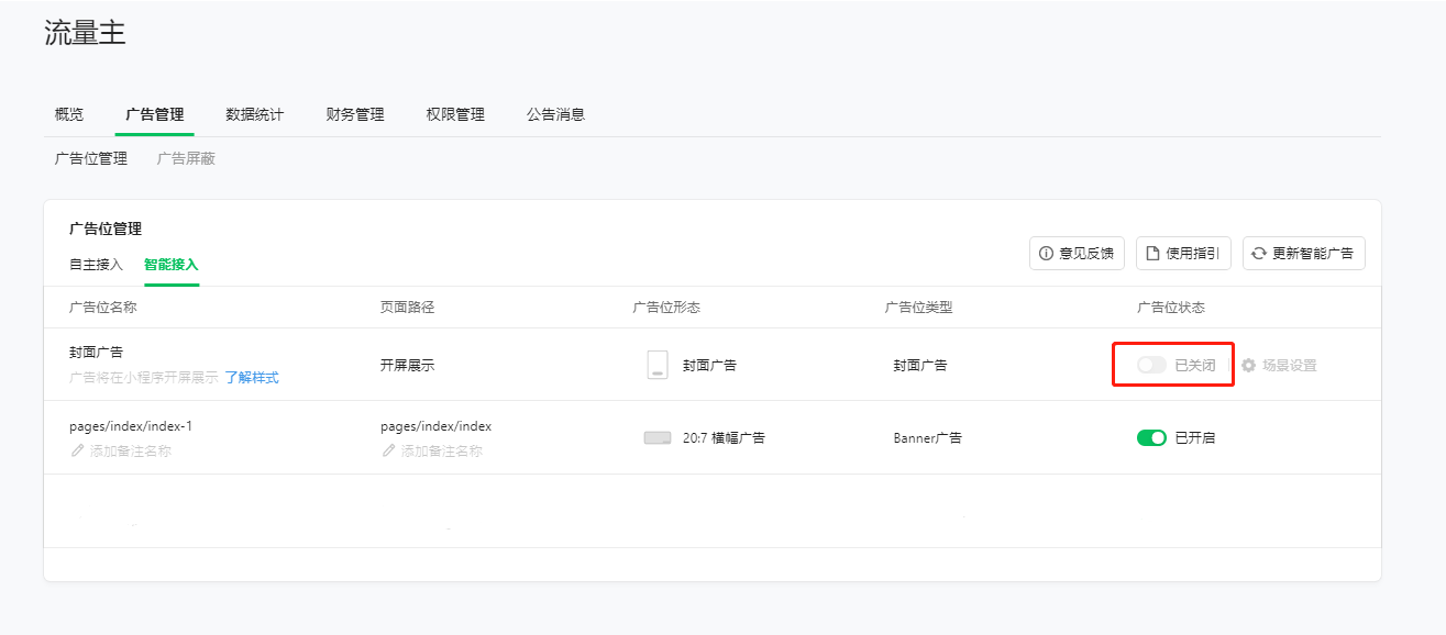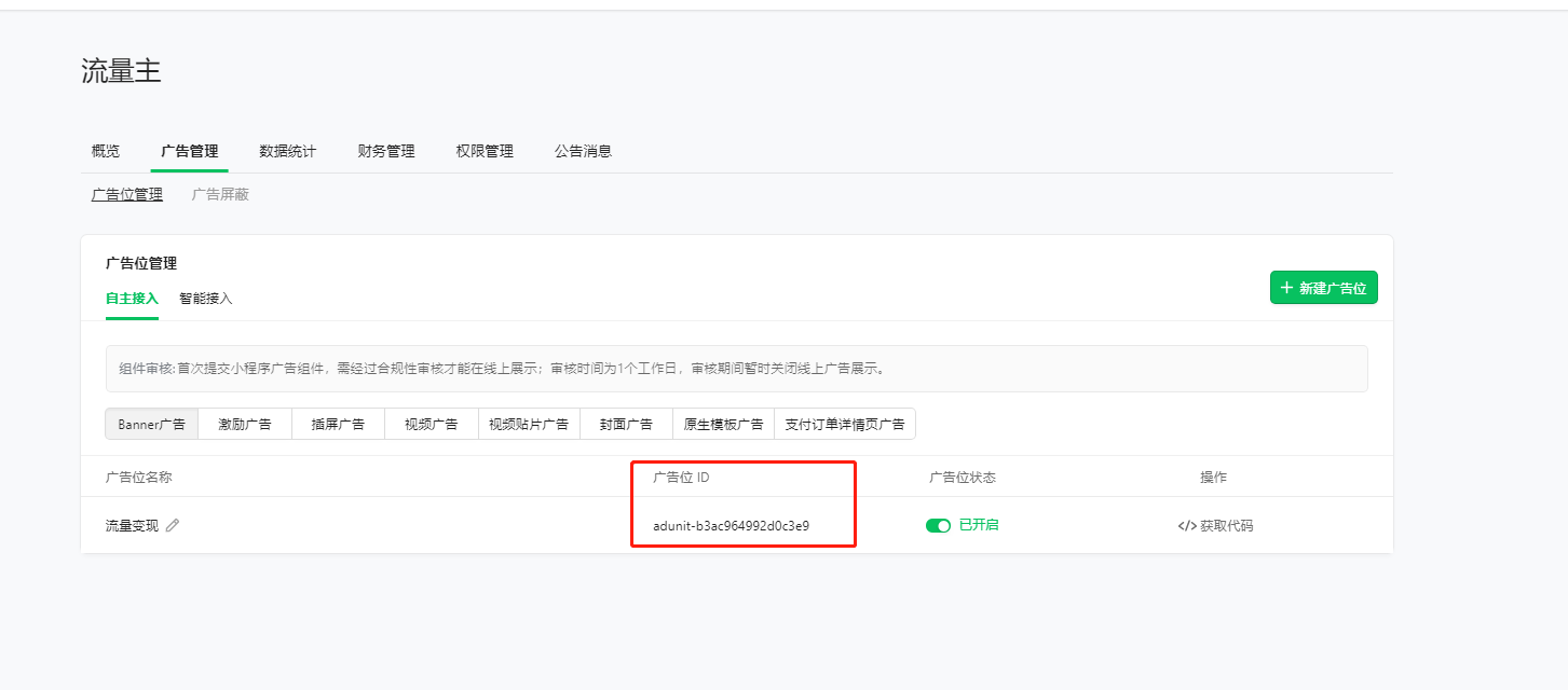 成功开通流量主功能的微信小程序,可进入【微信小程序后台-推广-流量主-广告管理】
