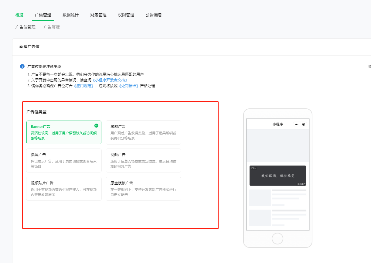 【自主开发接入】-能自己分配广告位展示位置,需要微信审核