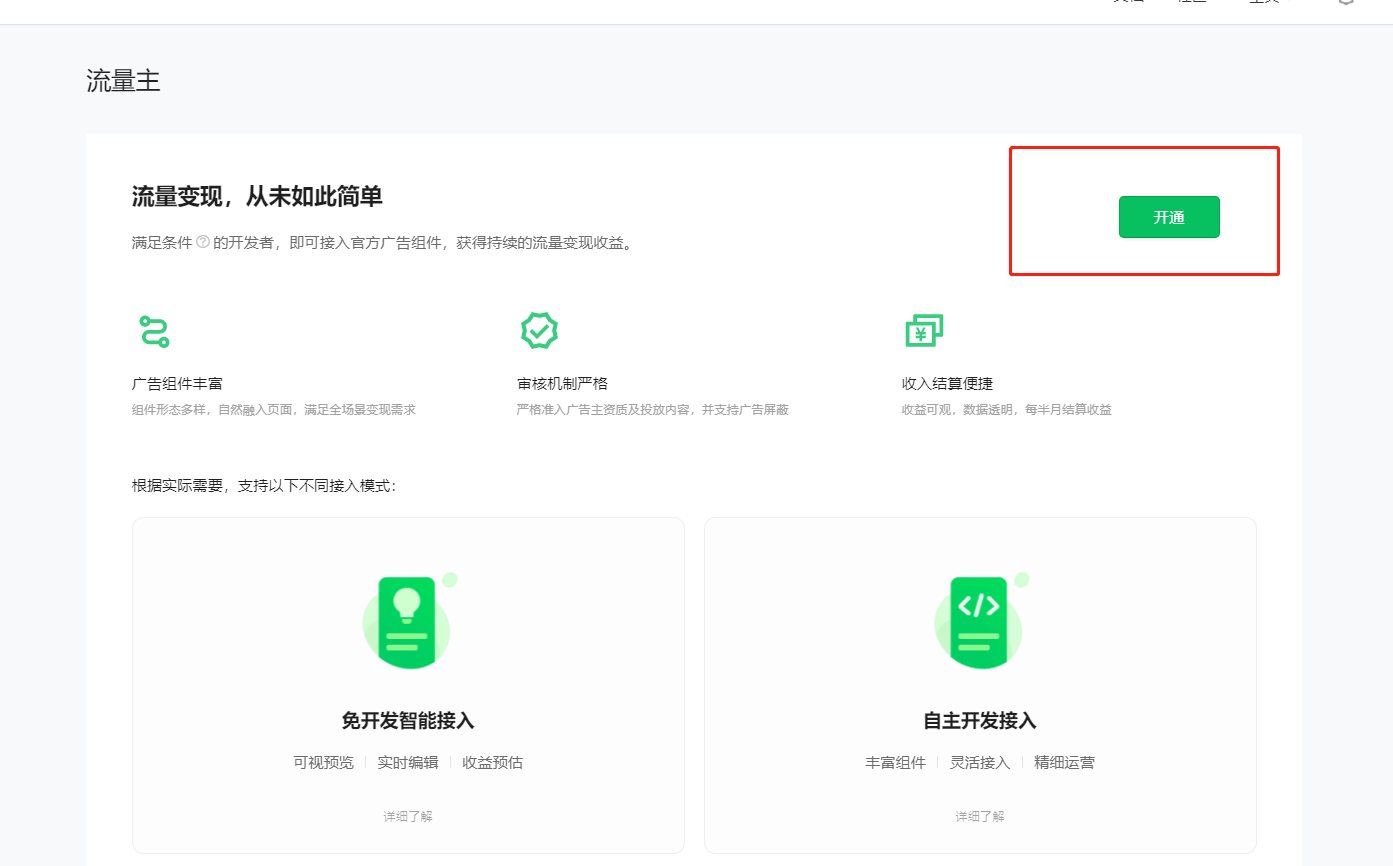 进入【微信小程序后台-推广-流量主】中,符合开通条件的微信小程序开发者点击“开通”,提交财务资料,待审核通过后成功开通流量主功能,即可创建相应的广告位。