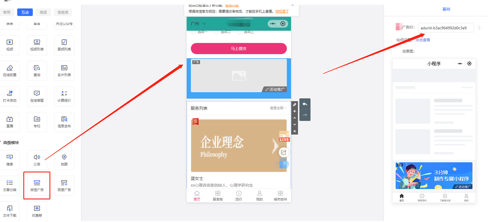 复制广告位id,在小程序设计页,使用微信广告模块,填写对应id即可在小程序自定义位置中展示
